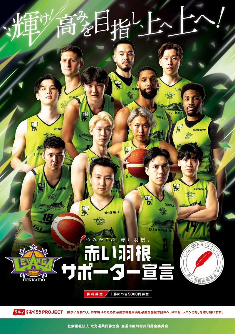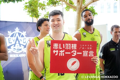 私たちレバンガ北海道は、社会貢献活動の一環として、北海道の福祉のため、『赤い羽根サポーター』として赤い羽根共同募金の活動に協力することを宣言します。